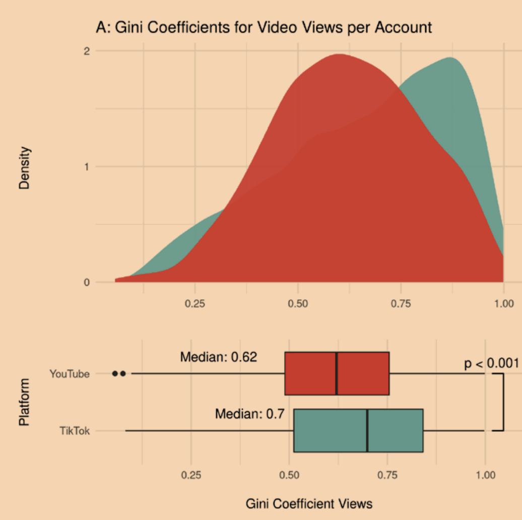 Or if you prefer peer-reviewed quantitative analysis, our paper finds significantly higher inequality in the viewership for a given account on TikTok than on YouTube.